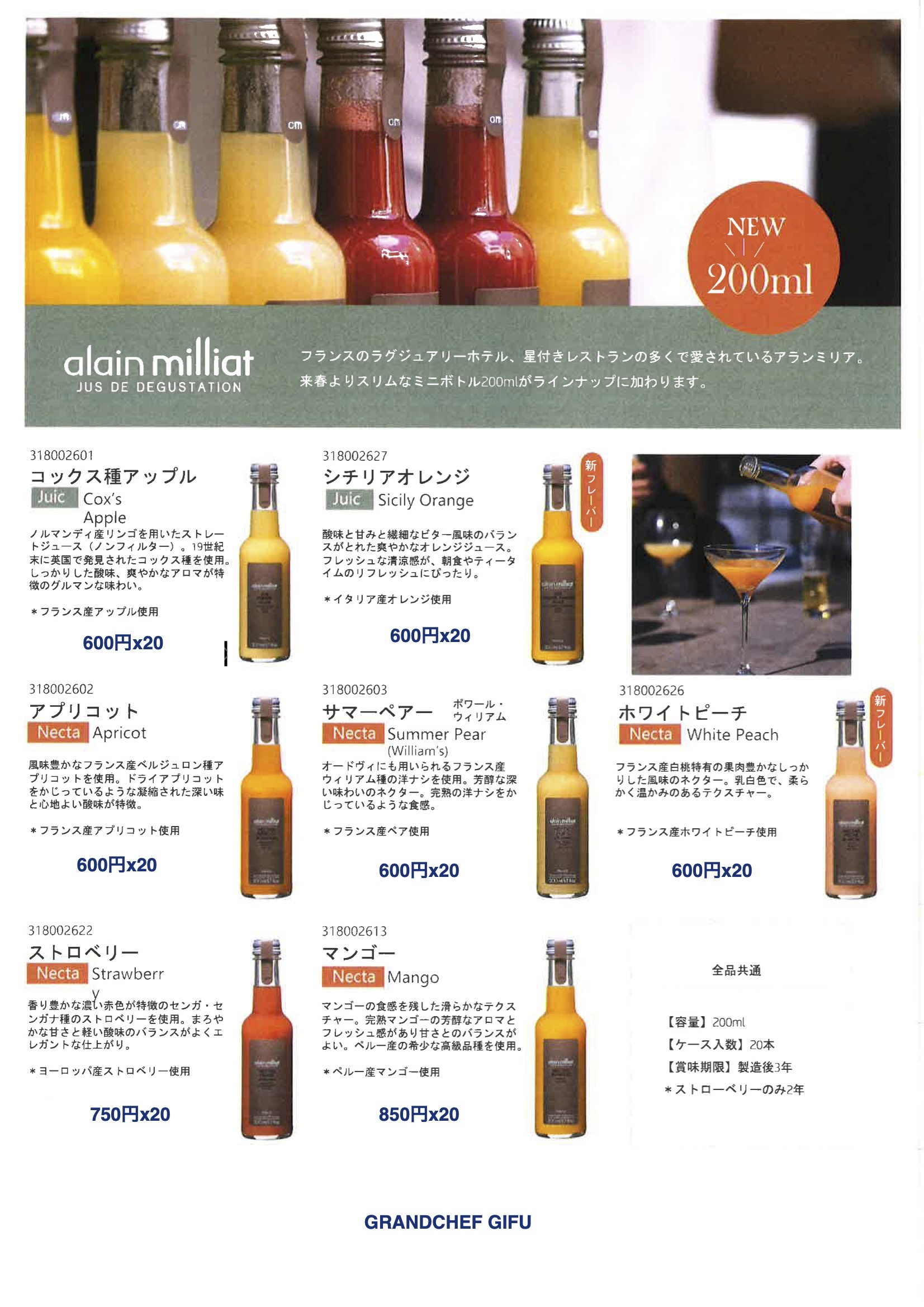アラン・ミリア(alain milliat) フランス・リヨン郊外で果樹園を営む家に生まれ育ち、自身も果樹園経営に長く携わってきたアラン・ミリア氏。「厳選した果実の採れたての美味しさをジュースやネクターを通して多くの人に伝えたい」という思いから、ルレ・エ・シャトーのソムリエ約60名と意見交換しながら商品を開発しました。 フルーツ栽培に関する深い知識と経験を活かし情熱を注いでつくり上げたジュースとネクターは、フランスが誇る美食のひとつとして注目を集めています。 また、そのこだわりと美味しさが認められ、現在フランスの4つ星、5つ星のホテルのうち約45パーセントで「アラン・ミリア」のジュース、ネクターが使用されています。